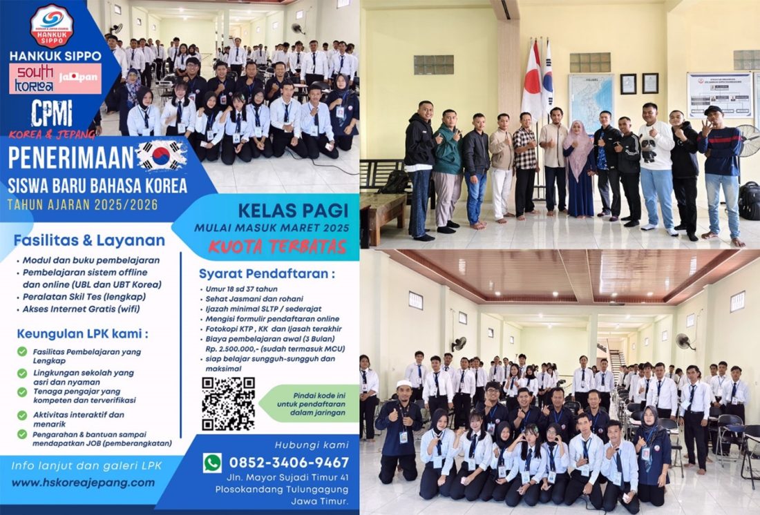 Kami LPK HANKUK SIPPO KOREA (TULUNGAGUNG) membuka Pendaftaran Siswa Baru Tahun ajaran thn 2025/2026 , Mulai Masuk Bulan Maret tahun 2025 untuk program khusus Bahasa Korea persiapan...