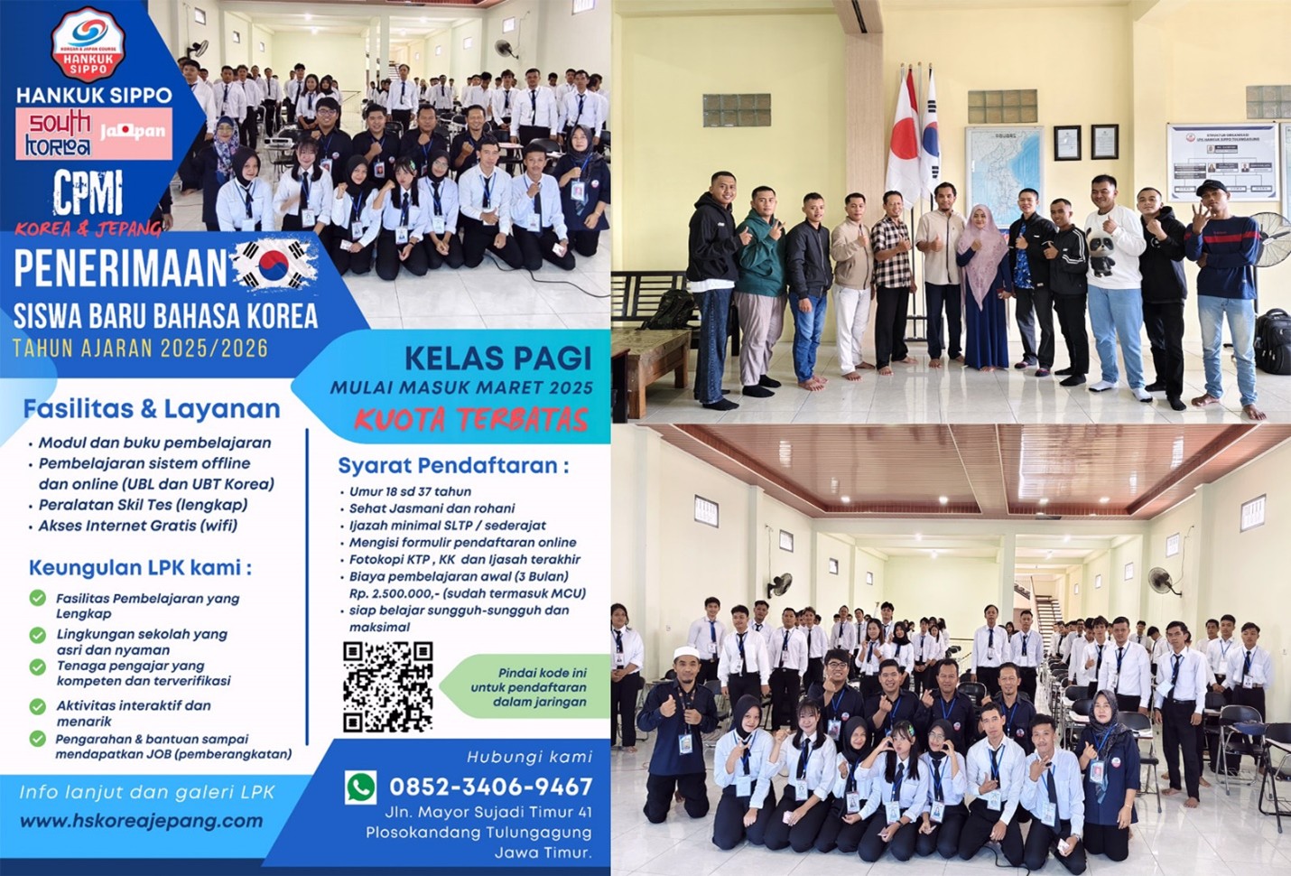 Kami LPK HANKUK SIPPO KOREA (TULUNGAGUNG) membuka Pendaftaran Siswa Baru Tahun ajaran thn 2025/2026 , Mulai Masuk Bulan Maret tahun 2025 untuk program khusus Bahasa Korea persiapan ujian EPS-TOPIK UBT dan Bahasa Jepang untuk Calon Pekerja Migran Indonesia (CPMI) dengan sistem Pembelajaran OFFLINE (TATAP MUKA) . Lulus Tes Bahasa Korea merupakan syarat mutlak CPMI untuk bisa melamar pekerjaan ke negara KOREA SELATAN.